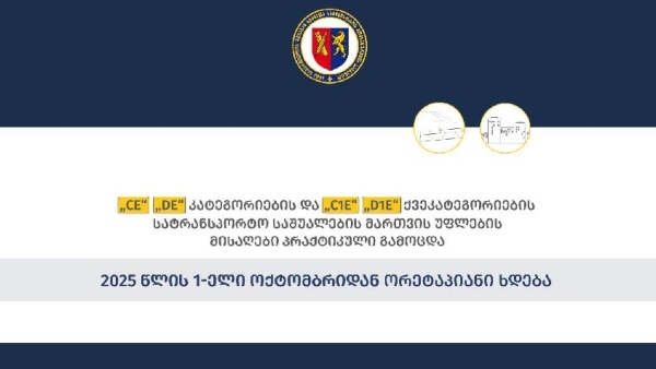 „საგზაო მოძრაობის შესახებ“ საქართველოს კანონში განხორციელებული ცვლილებების შესაბამისად, 2025 წლის 1-ელი ოქტომბრიდან CE, DE კატეგორიების და C1E, D1E ქვეკატეგორიების სატრანსპორტო საშუალების მართვის უფლების მისაღები გამოცდების პრაქტიკული ნაწილი ორეტაპიანი ხდება. ამის შესახებ ინფორმაციას საქართველოს შინაგან საქმეთა სამინისტროს მომსახურების სააგენტო ავრცელებს.